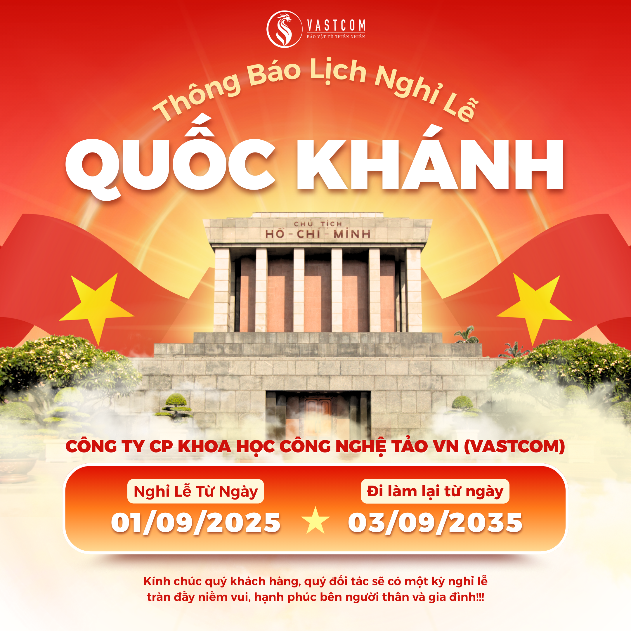 THÔNG BÁO LỊCH NGHỈ LỄ QUỐC KHÁNH 02/09/2025 CÔNG TY CP KHOA HỌC CÔNG NGHỆ TẢO VN (VASTCOM)